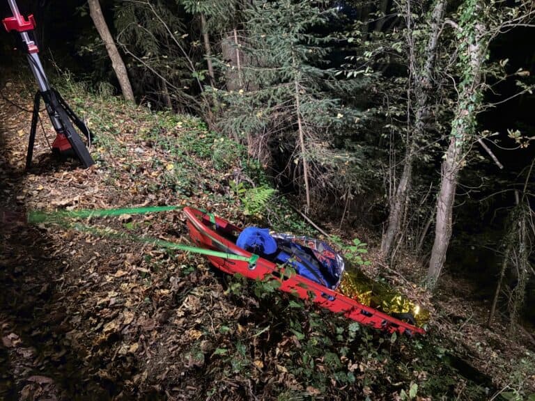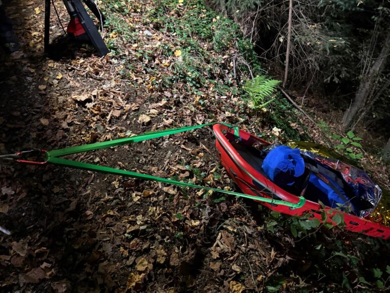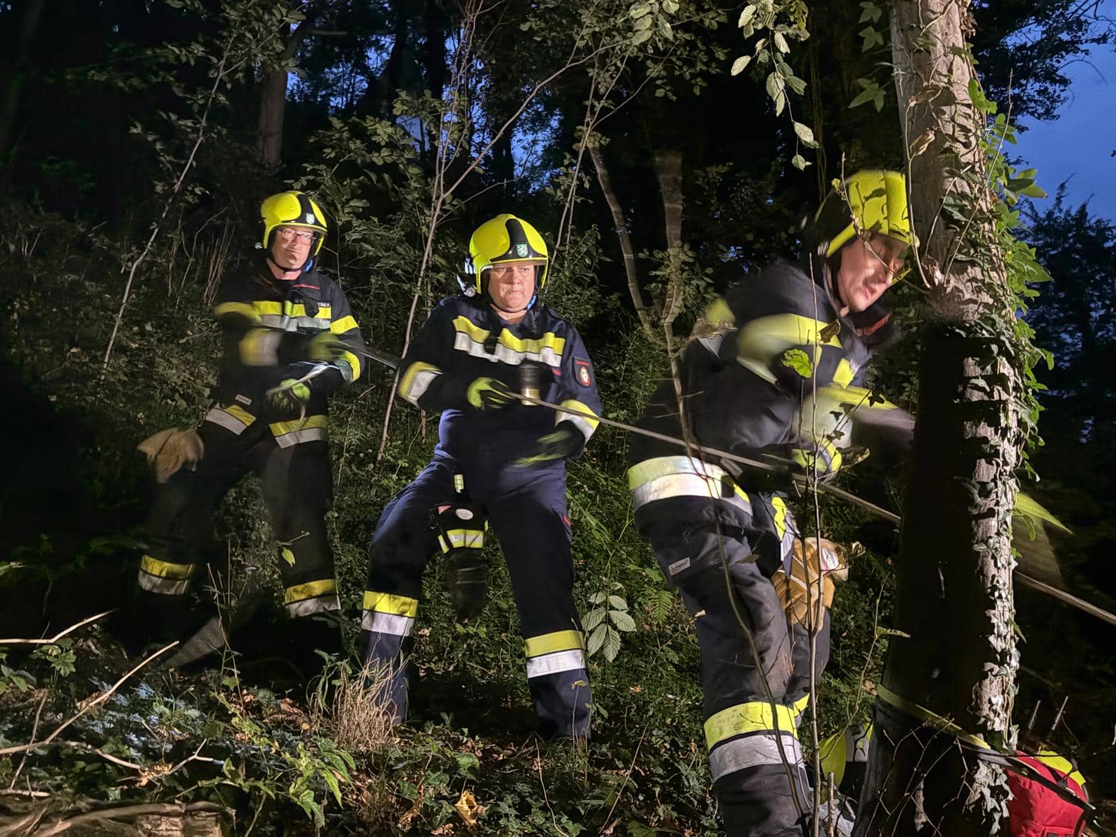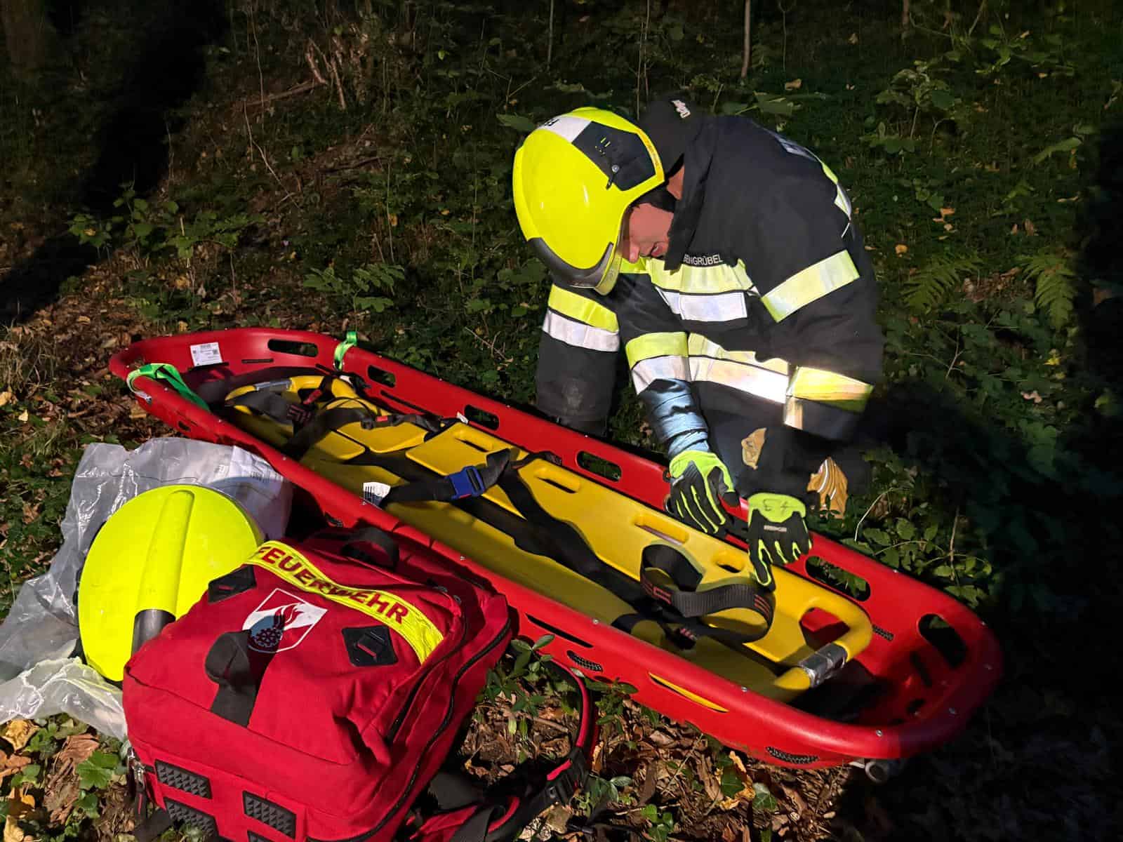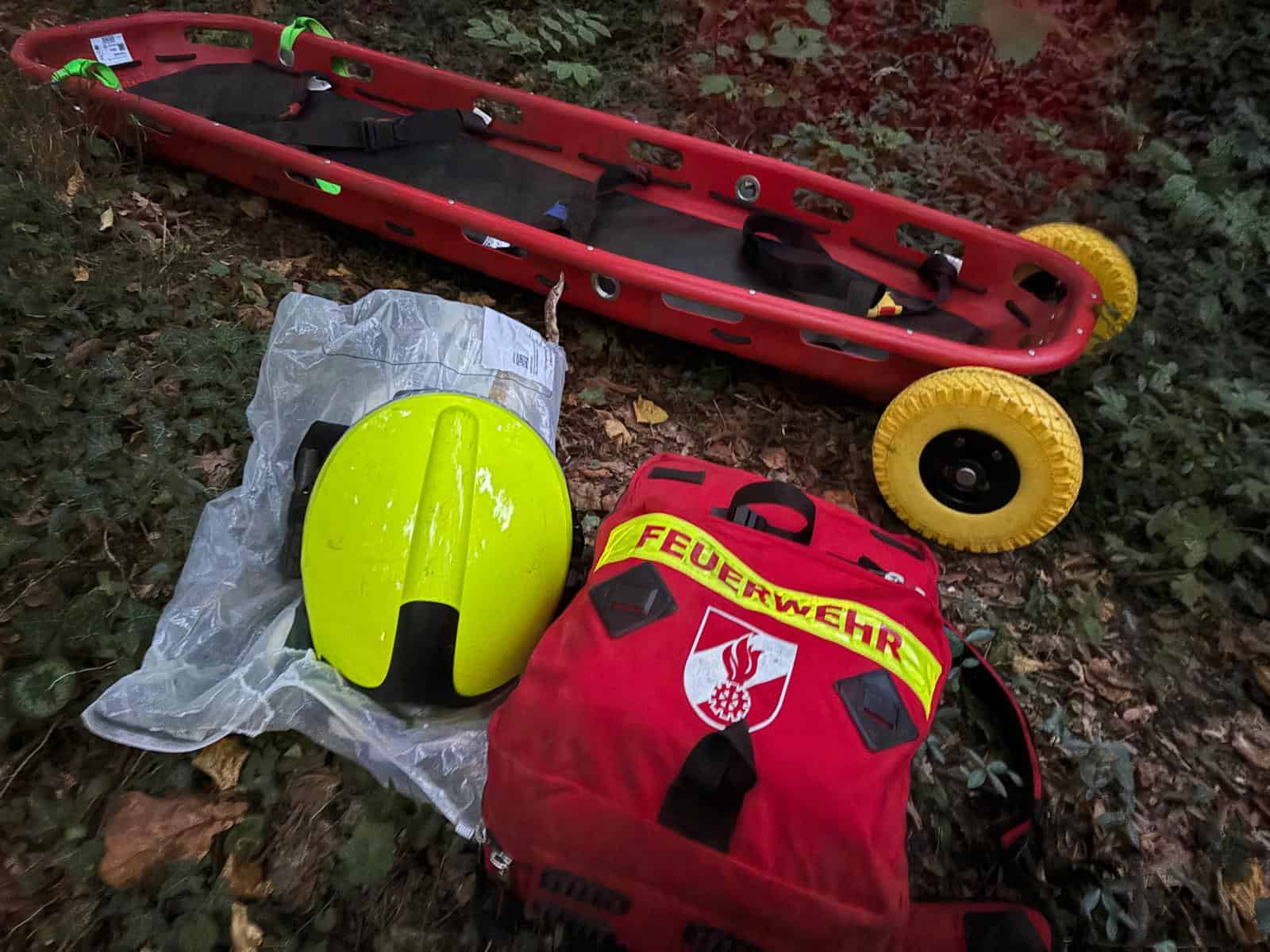 Bei unserer Allgemeinen Übung am 22.09.2025 befassten wir uns mit der Personenrettung aus unwegsamen Gelände. Am steilen Kirchberg waren zwei Person (Übungspuppen) in unwegsames Gelände abgestürzt und mussten von uns gerettet werden. Nach den erforderlichen sanitätstechnischen Maßnahmen wurden die Puppen unter Zuhilfenahme unserer Ausrüstung zur Menschenrettung (MRAS) während dem Einbruch der Dunkelheit aus dem steilen Gelände gerettet.