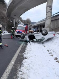 Die Landesleitzentrale „Florian Steiermark“ alarmierte am 02.01.2026 um 14:36 Uhr die Feuerwehren Übelbach/Markt und Deutschfeistritz mit dem Alarmstichwort T03 (Verkehrsunfall mit verletzter Person) zu einem Verkehrsunfall auf die A9, Pyhrnautobahn in Fahrtrichtung Spielfeld bei der Autobbahnauffahrt Übelbach. Ein PKW hatte sich überschlagen, dabei wurde eine Person unbestimmten Grades verletzt. Die einsatzleitende Feuerwehr Übelbach/Markt wickelte die erforderlichen Tätigkeiten an der Einsatzstelle ab, sodass unsere – mit 4 Fahrzeugen ausgerückten 22 Mitglieder – wieder in das Feuerwehrhaus einrücken konnten.