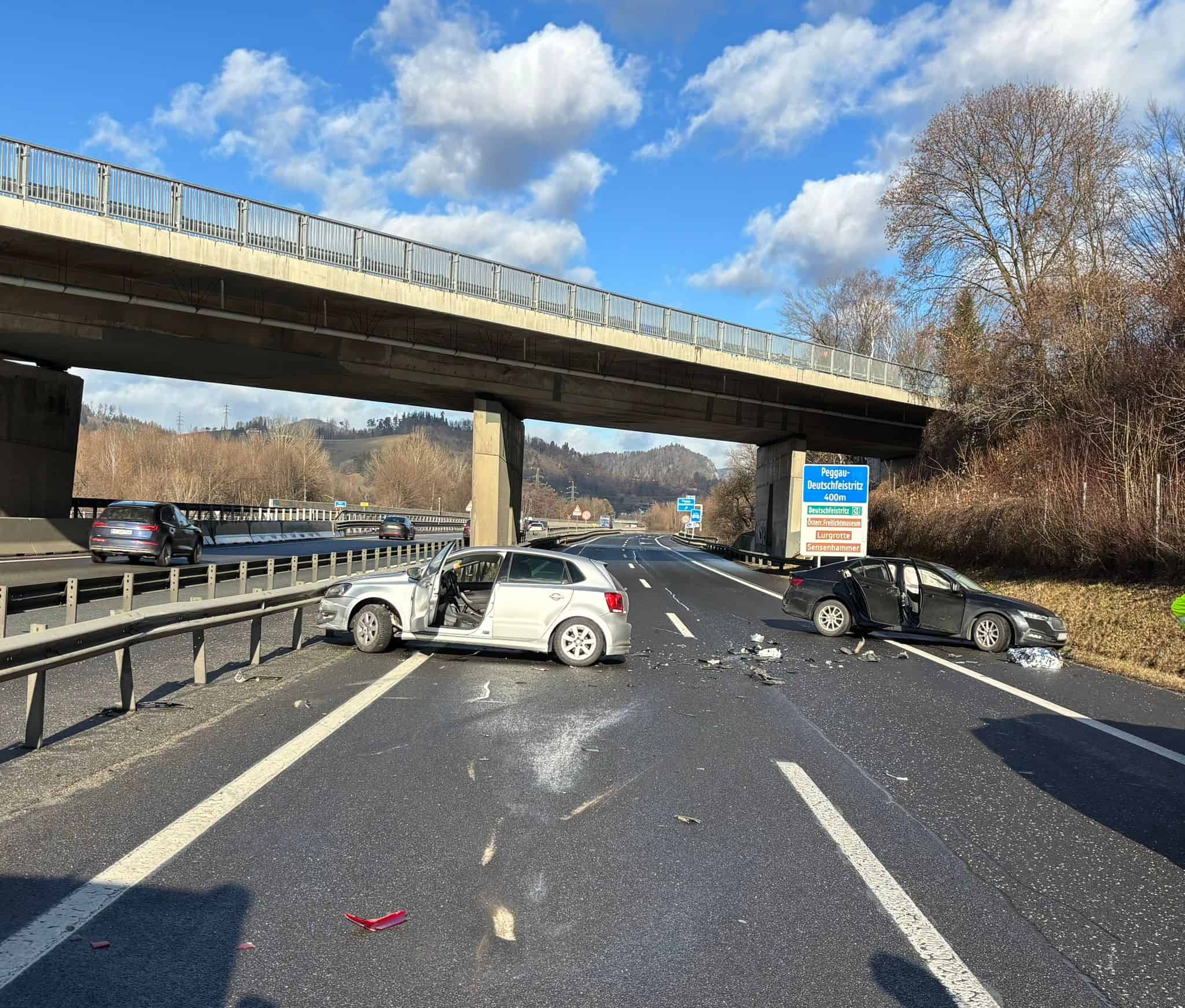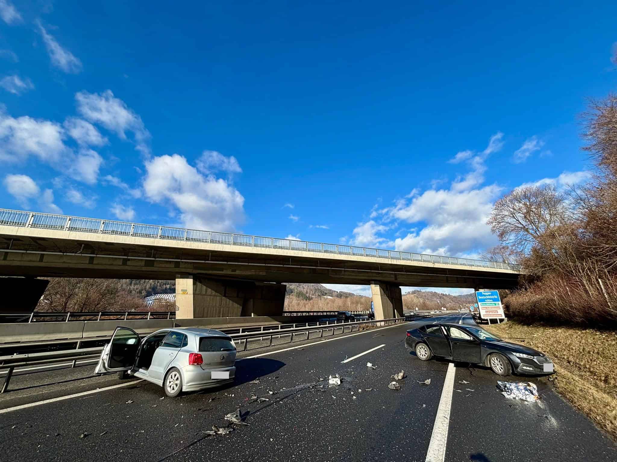 Am 10.01.2026 wurden seitens der Landesleitzentrale Steiermark um 11:27 Uhr gemäß Autobahnalarmplan die Feuerwehren Deutschfeistritz und Friesach/Wörth mit dem Alarmstichwort T03-V (Verkehrsunfall mit verletzter Person) zu einem Verkehrsunfall auf der A9 beim Knoten Deutschfeistritz in Fahrtrichtung Bruck/Mur alarmiert. Zwei Fahrzeuge waren kollidiert, dabei wurden 2 Personen unbestimmten Grades verletzt und vom anwesenden Rettungsdienst versorgt. Die einsatzleitende Feuerwehr Friesach/Wörth wickelte den Einsatz ab sodass unsere – mit HLF 3, KRFS-Tunnel und VFA ausgerückten 18 Personen – den Einsatz beenden und in das Feuerwehrhaus einrücken konnten.